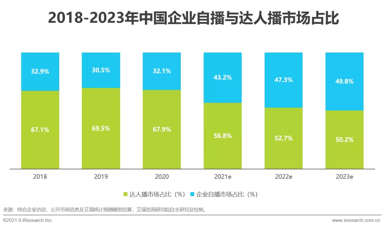 艾瑞咨詢《2021年中國直播電商行業研究報告》顯示,目前品牌自播已經成為眾多品牌的主要銷售場景之一,2020年店播成交額占到整體直播電商的32.1%,預計2023年占比將接近50%,企業通過常態化自播能夠獲得更加可控的成本投入與更穩定的銷量增長。
